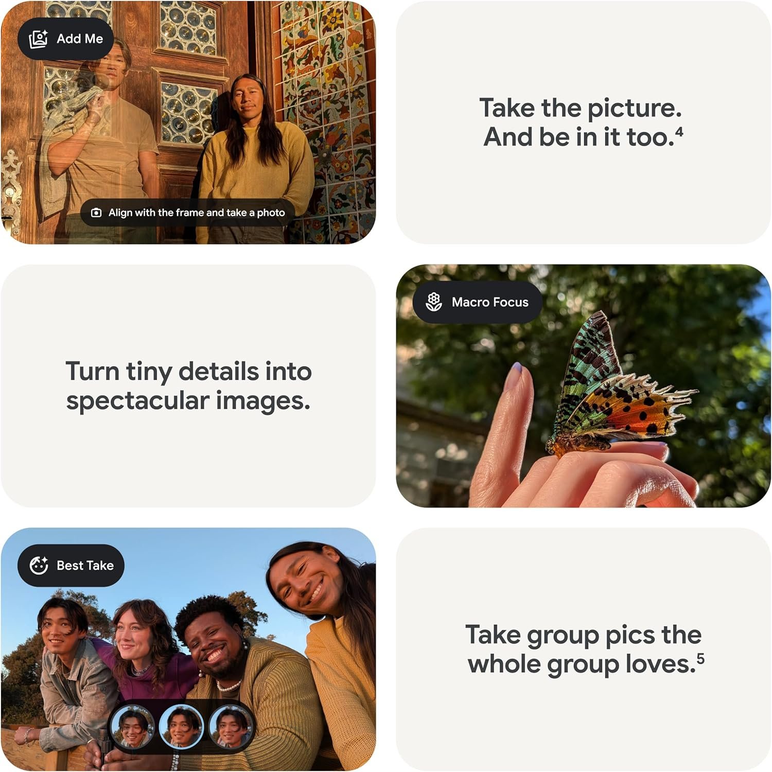- Take amazing photos and videos with the Pixel Camera, and make them better than you can imagine with Google AI; get great group photos with Add Me and Best Take[; and use Macro Focus for spectacular images of tiny details like raindrops and flowers