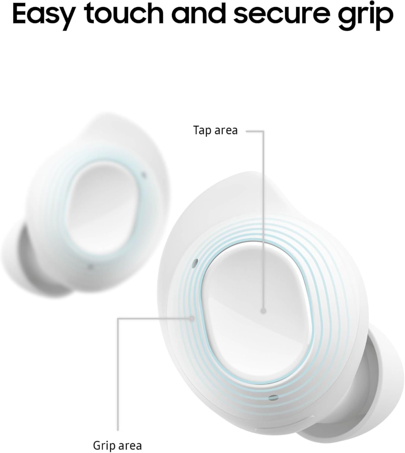 - EASILY CONTROL WITH A TAP: With clearly defined areas for tapping and gripping, it’s easy to secure them, pause the audio and change the volume with a simple tap; The areas even look and feel different so your finger can find them easily