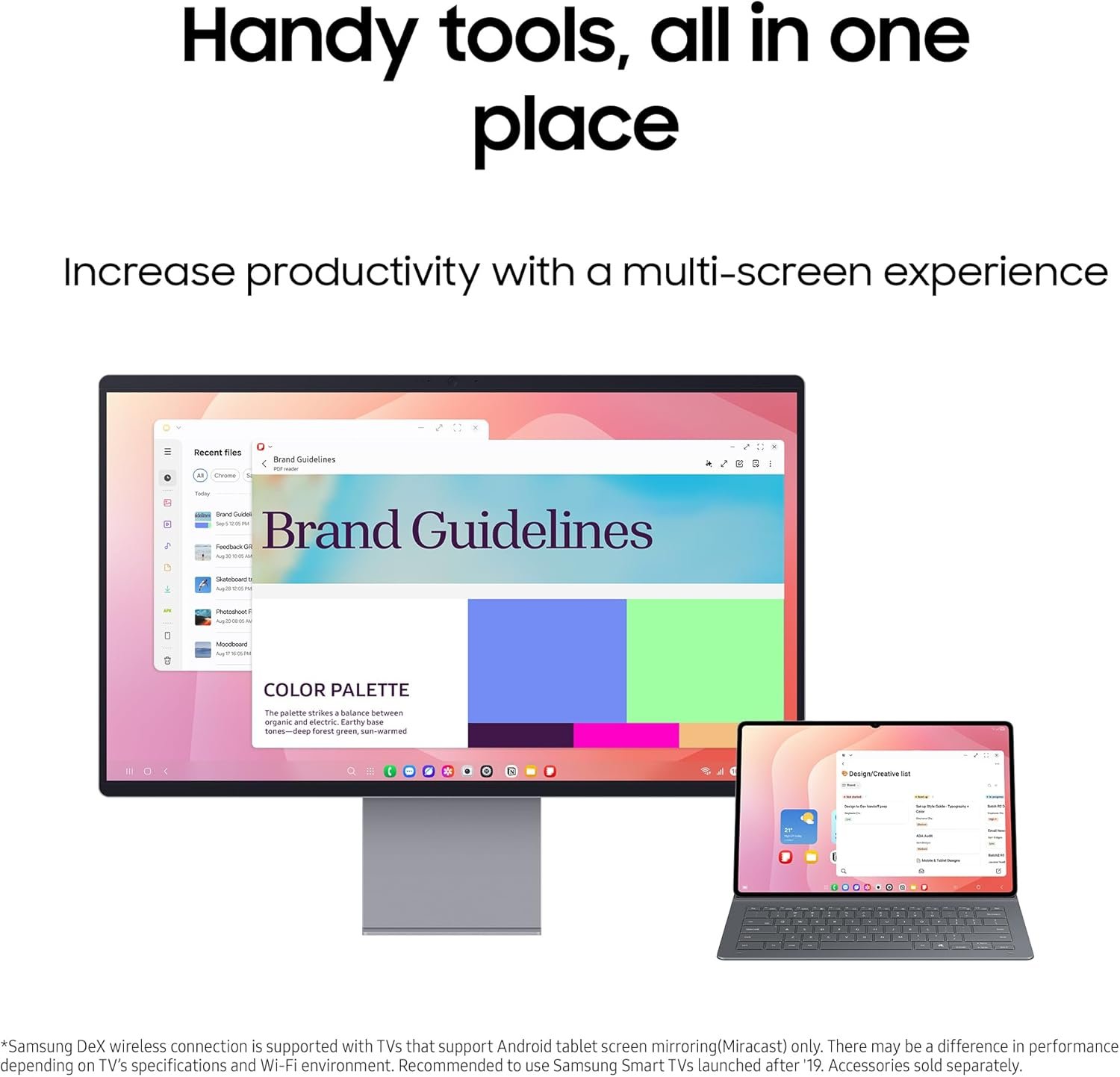 - Samsung DeX: Extend your Galaxy tablet’s display to create a multitasking environment of up to 4 workspaces; Increase your productivity with drag and drop windows and movable apps, and enjoy saved content at home with screen mirroring